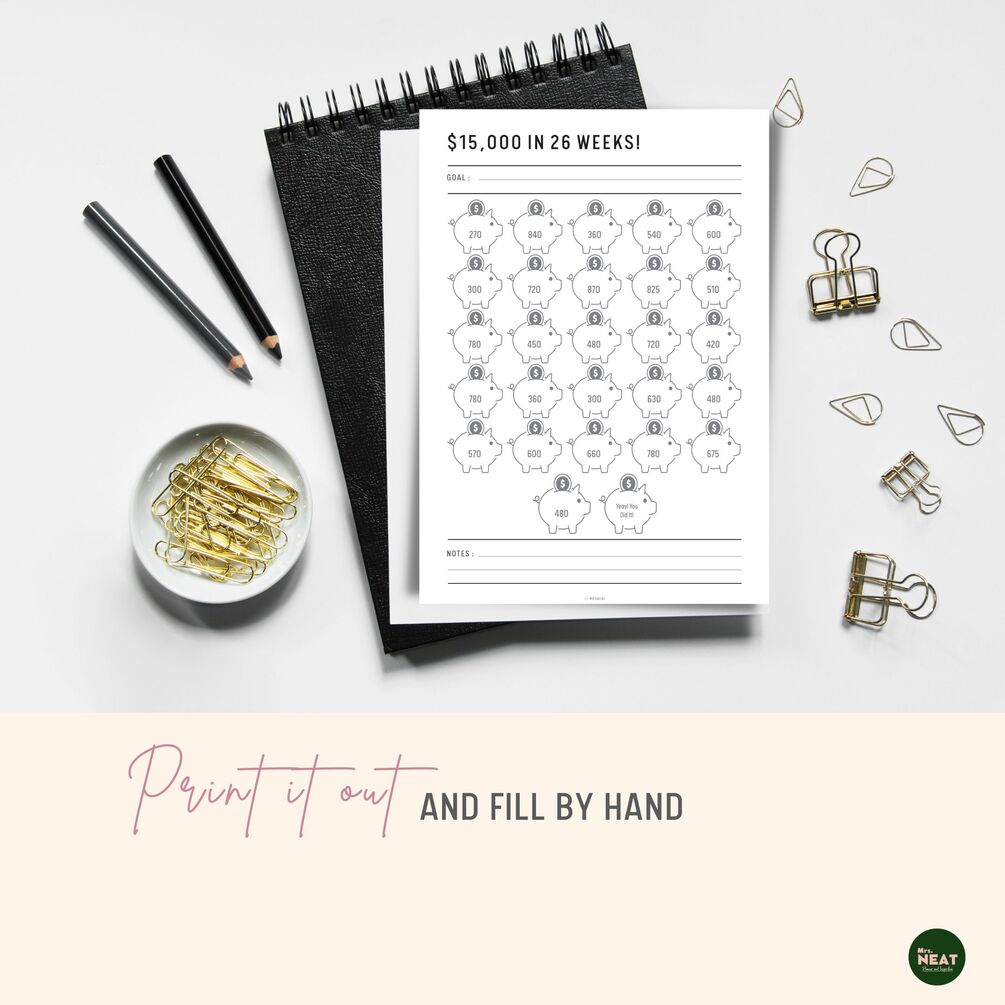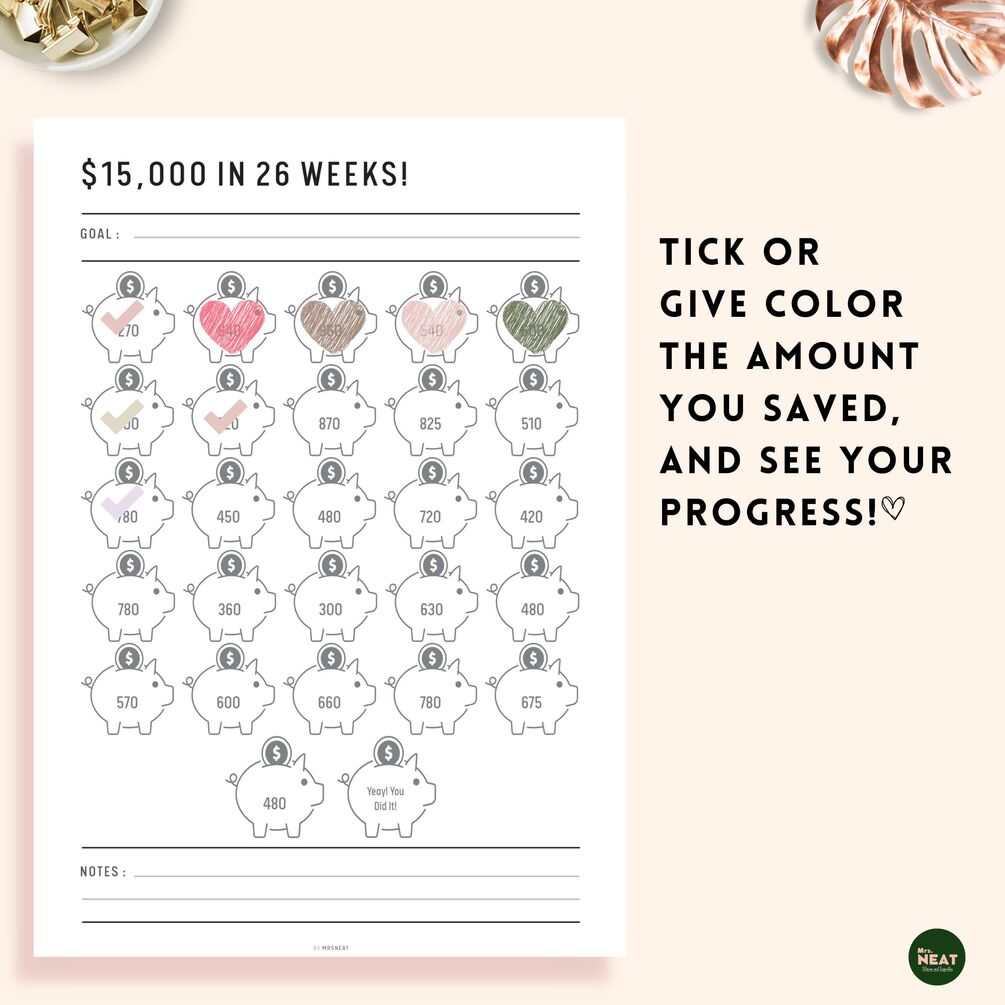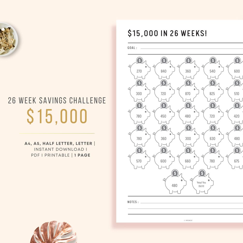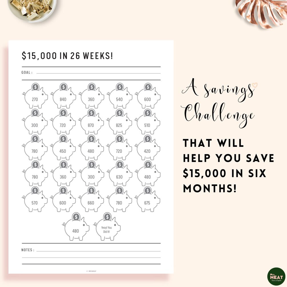 This printable features 26 piggy banks, one for each week of the half-year, and is designed to help you save $15,000 in just 26 weeks.